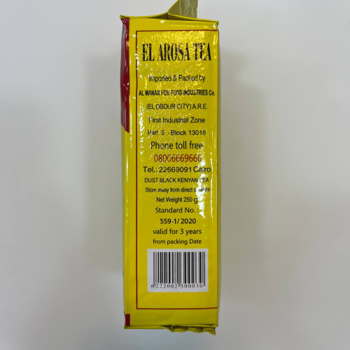 Чёрный чай премиум класса El Arosa Tea - это не классический вид чая (как в нашем понимании, как мы привыкли видеть). Фирма El Arosa изготавливает чай ультра-мелкого помола, без каких-либо добавок. Чай быстро заваривается. С листов чая египетские производители не делают вытяжку танина, благодаря чему в нём сохраняются все полезные свойства, вкус, аромат и чай придает бодрость.